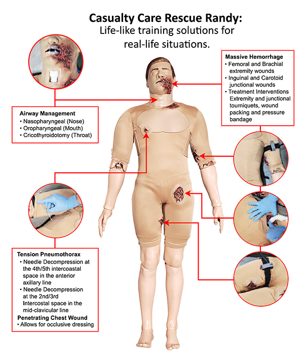 The Casualty Care Rescue Randy is a rugged, affordable full-body manikin for realistic training in treating the three most preventable causes of death: massive bleeding, tension pneumothorax and airway obstruction.